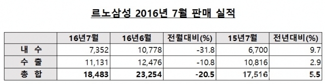 르노삼성자동차가 7월 한 달간 내수 7352대, 수출 1만1131대 등 총 1만7516대를 판매했다고 1일 발표했다. 7월 판매 실적은 지난해 같은 달보다 5.5%가 증가했지만, 앞선 6월과 비교해 20.5%나 급락했다.