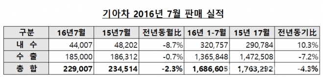기아차는 7월 한 달간 국내외 시장에서 전년대비 2.3% 감소한 22만9007대를 판매했다고 1일 밝혔다.