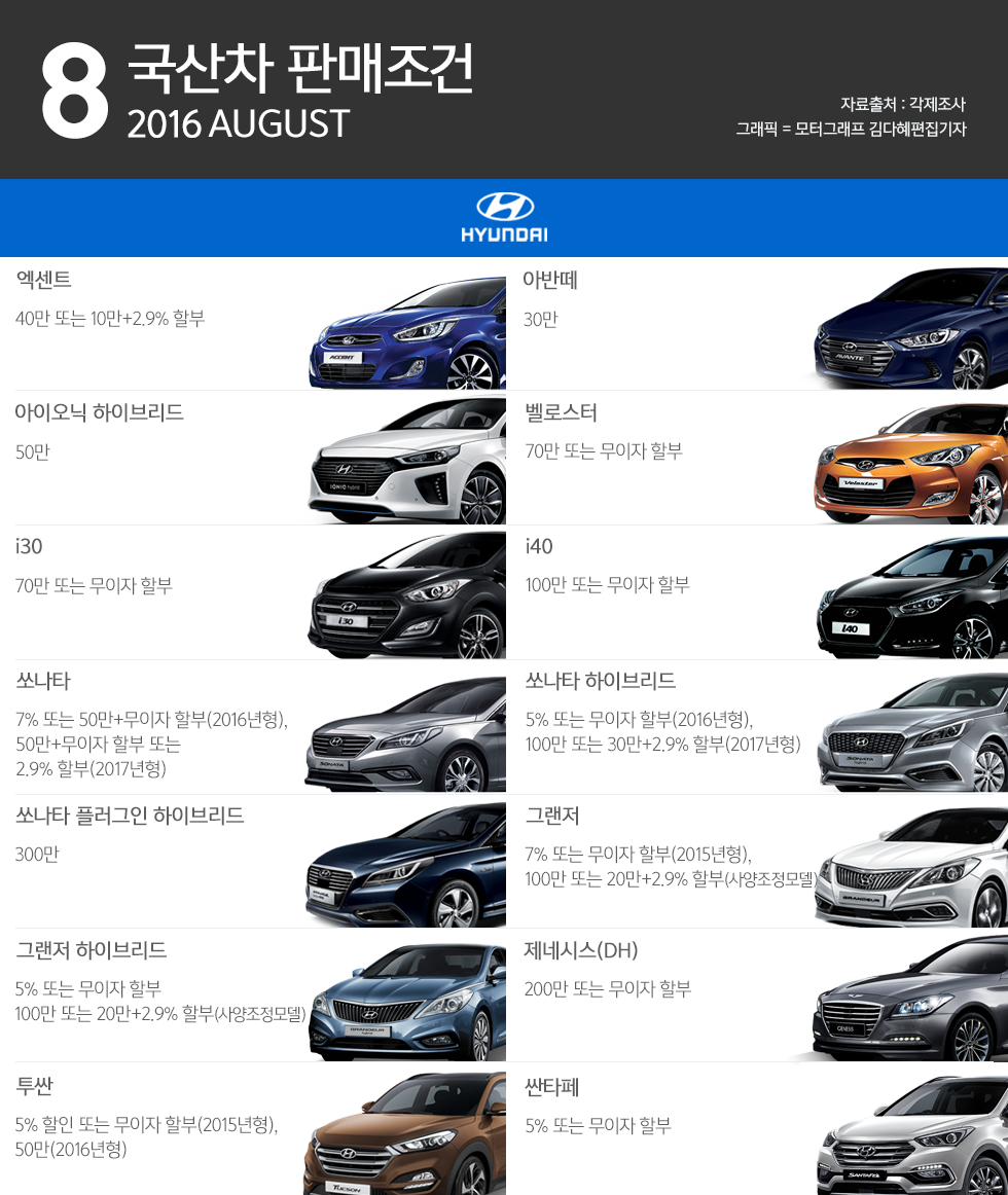 모터그래프는 1일, 국산차 업체들의 8월 판매조건을 정리했다.