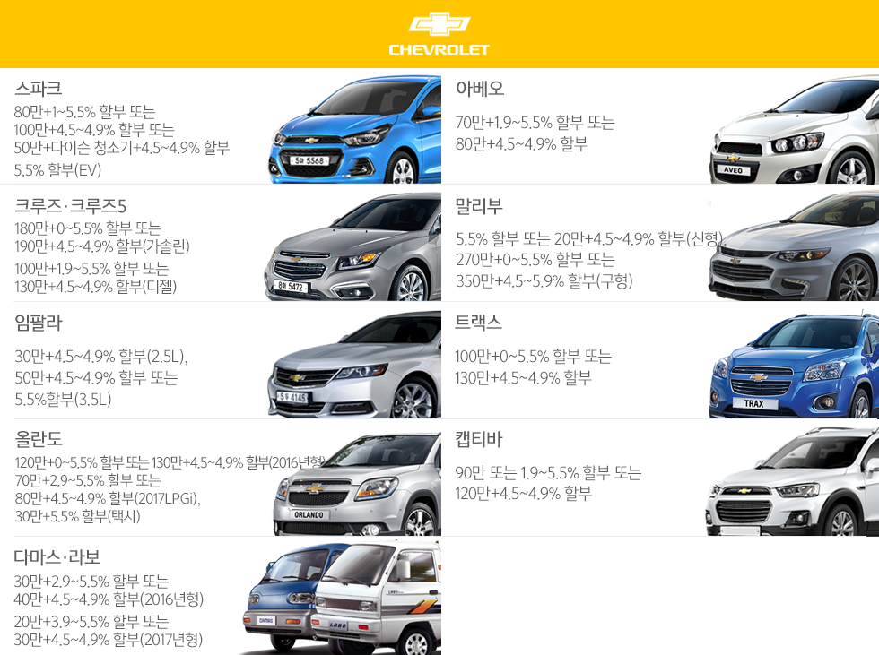 차종별로는 스파크의 경우, 80만원 할인과 1~5.5% 할부를 제공하며, 100만원 할인과 할부 기간에 따라 4.5~4.9% 할부를 동시에 지원하는 쉐보레 콤보할부 구매 프로그램을 선택할 수 있다. 여기에 50만원 할인과 다이슨 청소기, 4.5~4.9% 할부 혜택도 고를 수 있다. 아베오는 80만원 할인과 4.5~4.9% 할부(또는 70만원+1.9~5.5% 할부)가 지원된다.