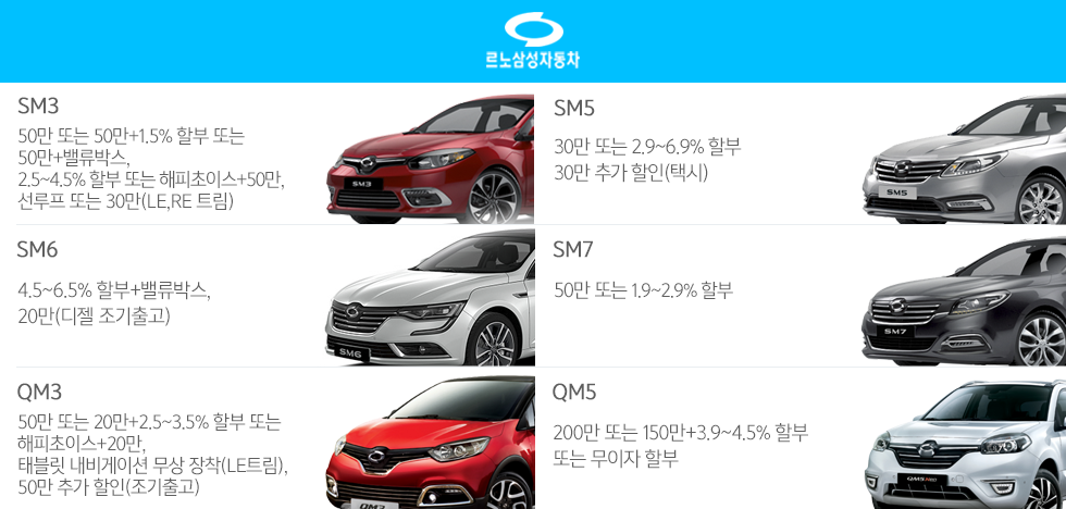 SM5 구매자에게는 현금 구입 시 30만원을 지원하고, 2.9~6.9% 할부도 제공한다. 또, 택시 구매자에게는 30만원을 추가로 할인해준다. SM6의 경우 별도의 할인 없이 4.5~6.5% 할부와 밸류박스 프로그램을 제공하며, 이달 출시된 SM6 디젤을 조기출고하는 소비자에게는 20만원의 추가할인을 지원한다. SM7은 현금 구매 시 50만원을 할인해주고, 1.9~2.9% 할부 프로그램도 선택할 수 있다.