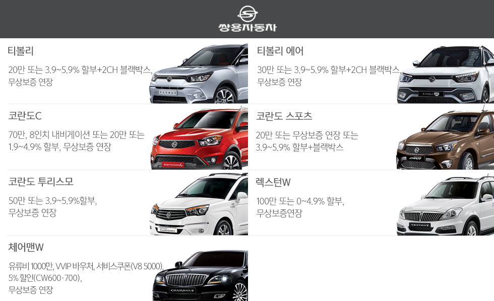 코란도 스포츠의 경우, 20만원(또는 무상보증 연장)을 할인해주고, 3.9~5.9% 할부와 블랙박스 무상 제공 등의 할인을 지원받을 수 있다. 코란도 투리스모는 50만원 또는 3.9~5.9% 할부 중 선택할 수 있다. 렉스턴W 구매자에게는 100만원(또는 무이자~4.9% 할부)을 지원한다.