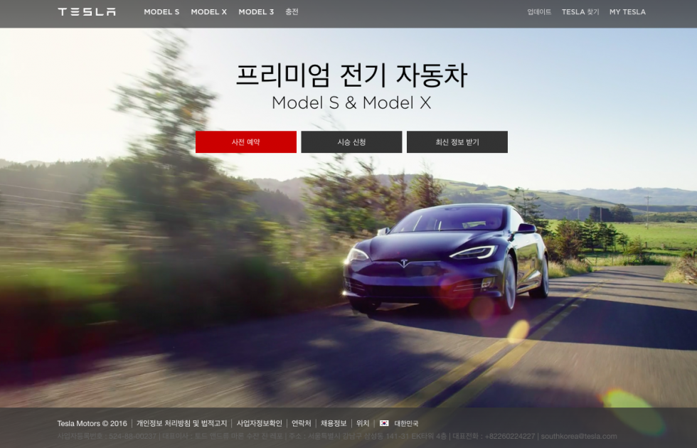 테슬라 한국 홈페이지는 영문 홈페이지와 크게 다르지 않았다. 모델 S, 모델 X, 모델 3의 자세한 정보를 확인할 수 있으며 사전 예약, 시승 신청 등도 가능하다.