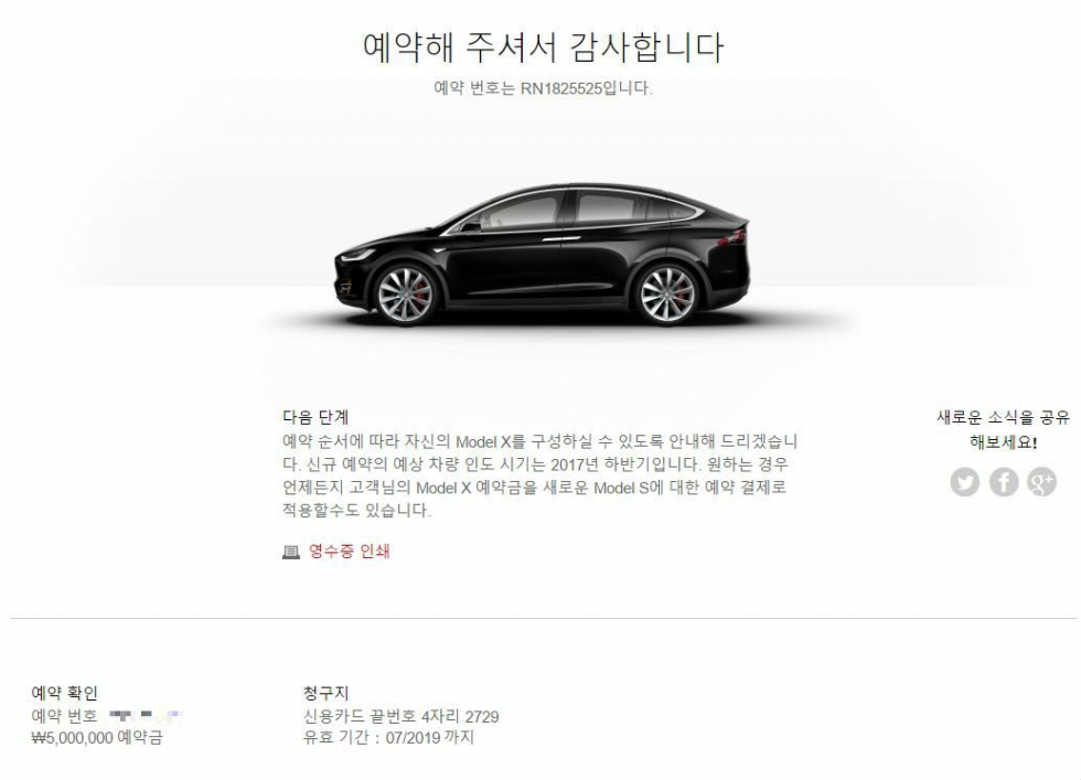 사전 예약도 마찬가지다. 다만 사전 예약의 경우 모델 X는 500만원, 모델 S는 200만원, 모델 3는 100만원의 선금을 지불해야 예약이 완료된다. 테슬라 홈페이지에 따르면 사전 예약을 하면 구매 우선순위를 보장받을 수 있고, 차량을 구매하지 않을 경우에는 예약금은 전액 환불된다. 테슬라는 모델 X의 국내 인도 시기를 2017년 하반기로 잡았다.