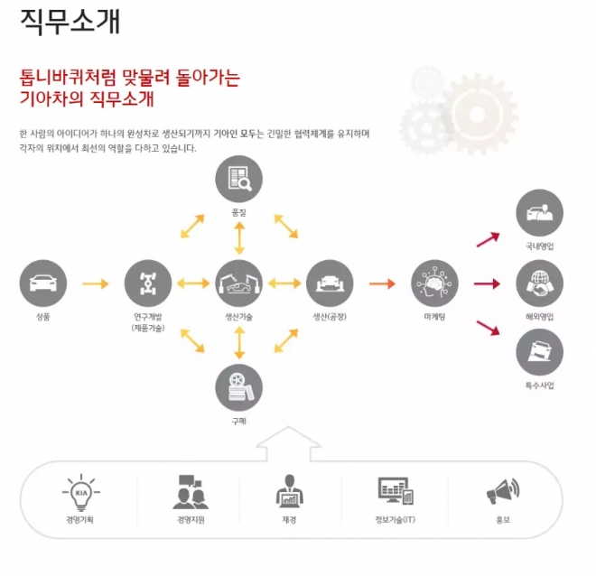 기아차는 K형, I형, A형으로 지원부문을 구분해 채용을 진행한다. K형은 마케팅, 상품, 국내외 영업 부문으로 창의력과 통찰력, 분석적 사고를 요구한다. I형은 생산기술, 생산공장, 품질, 구매 부문으로 책임감과 소통을 강조했다. A형은 경영기획, 경영지원, 재경, 홍보, 정보기술 부문으로 추진력과 도전 정신을 살펴본다.