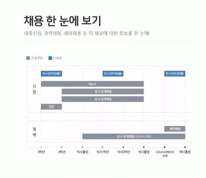 한편, 취업 및 인사 전문가들은 현대차그룹 내 다양한 인재 전형 프로그램 활용을 조언했다. 현대차의 경우 공채 외 인턴과 상시채용(the H 등), 해외채용, 연구장착생 등을 통해 입사 대상자를 선발하고 있다.