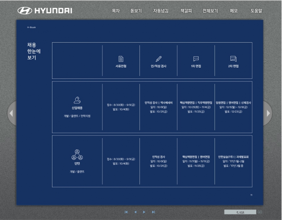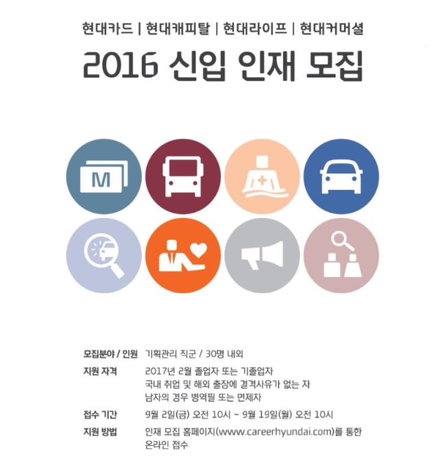 공채 일정은 이달 29일 기아차를 시작으로 30일 현대차와 현대엔지니어링 등이 각 사별 채용 사이트를 통해 서류 전형에 나섰다. 9월 첫째주는 현대모비스와 현대글로비스(1일), 그리고 현대카드(2일)가 원서를 접수받고, 둘째주는 현대제철(5일) 서류 전형이 진행된다. 현대건설은 9월 중 날짜가 예고됐다.