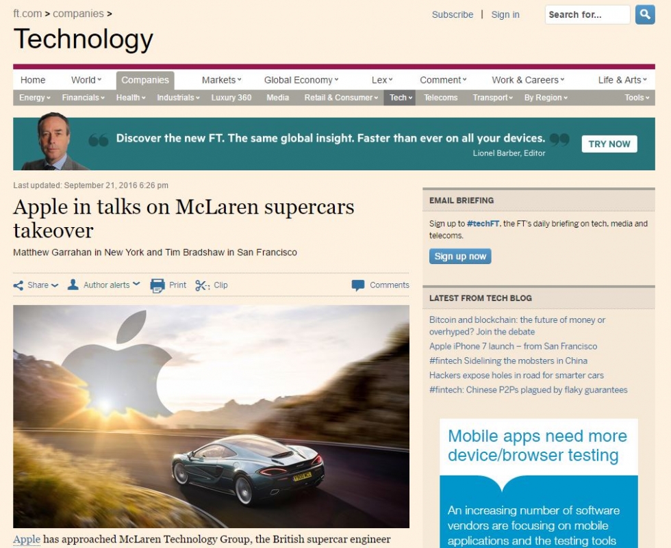 영국 파이낸셜타임즈는 21일(현지시각), 애플이 몇 개월 전부터 맥라렌을 인수하기 위한 협상을 벌이고 있다고 보도했다.