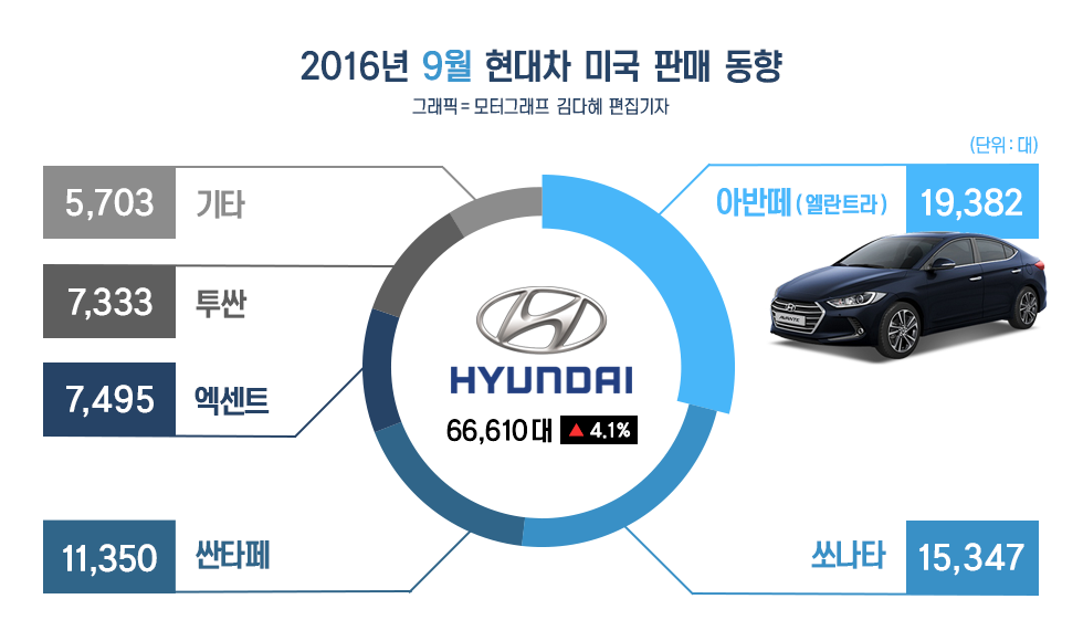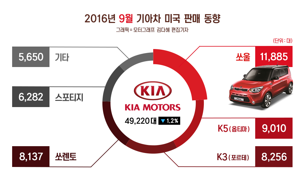 현대차는 주력인 엘란트라(국내명 아반떼)와 쏘나타 판매가 소폭 감소했지만, 싼타페와 엑센트, 벨로스터 등 판매가 늘어났다. 기아차는 쏘울과 옵티마(국내명 K5), 쏘렌토 등 판매가 줄며, 지난해 같은 달보다 실적이 하락했다.