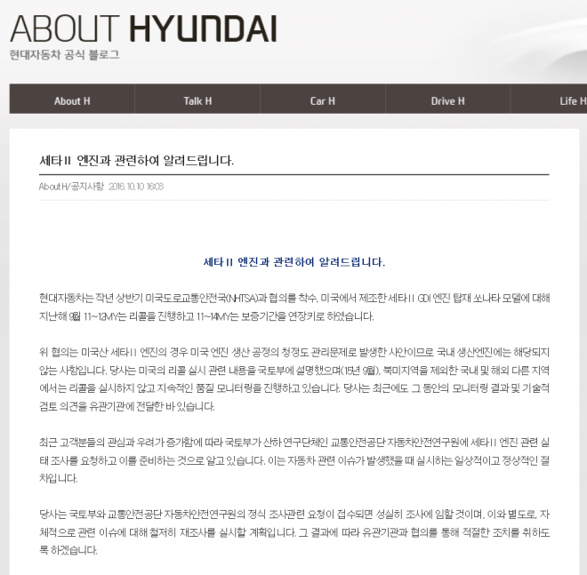 현대차가 10일 공식 블로그를 통해 미국에서 발생한 세타II 엔진 결함에 대한 입장을 표명했다.