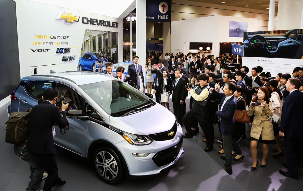 한국GM은 26일 서울 삼성동 코엑스에서 개막한 '2016 한국전자전(KES: Korea Electronics Show)'에 참가해 브랜드 전용 전시 공간을 마련하고, 쉐보레 볼트 EV 등 친환경차를 전시했다.