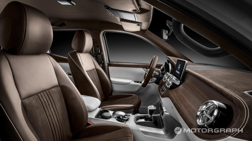 실내는 메르세데스-벤츠의 최신 구성과 픽업트럭 특유의 실용적인 디자인이 적절히 조합됐다. 3 스포크 스티어링 휠과 돌출형 디스플레이, 특유의 터치패드 등이 탑재됐고, 기어노브는 스티어링 휠 우측에 붙어 있는 다른 모델들과 달리 센터에 위치했다. 또, 사이드 브레이크를 적용해 픽업트럭 특유의 느낌을 살렸으며, 차량에 SIM 카드 가 탑재돼 인터넷 및 스마트폰 연동 기능도 강화했다.
