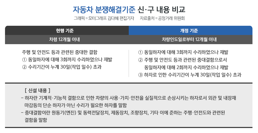 공정거래위원회는 26일, 자동차 교환 및 환급 요건을 완화하는 내용의 소비자분쟁해결기준 개정안을 발표하고 이를 시행한다고 밝혔다.