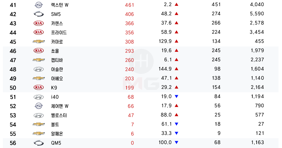 기아차 쏘울과 K9을 비롯, 쉐보레 캡티바와 아베오, 현대차 아슬란과 i40 등은 10여 종은 이보다도 판매량이 떨어지는 굴욕을 맛봤다. 특히, 쏘울과 캡티바, 아베오는 최근 페이스리프트 모델이 출시된지 얼마 안됐고, 아슬란도 디자인이 꽤 변화된 연식 변경을 거쳤는데도 전혀 나아진게 없다.
