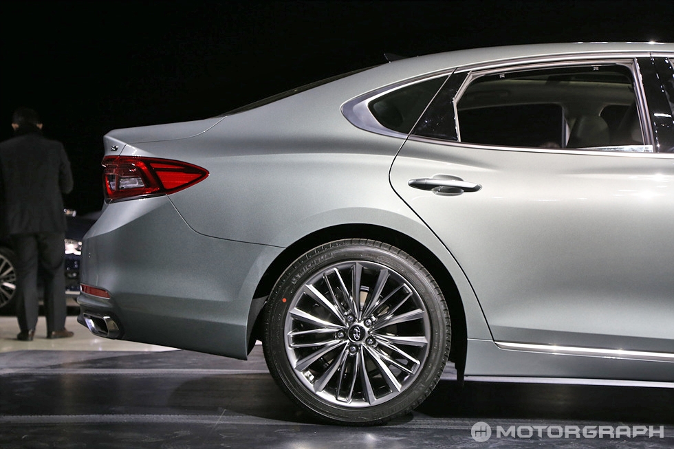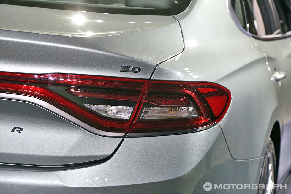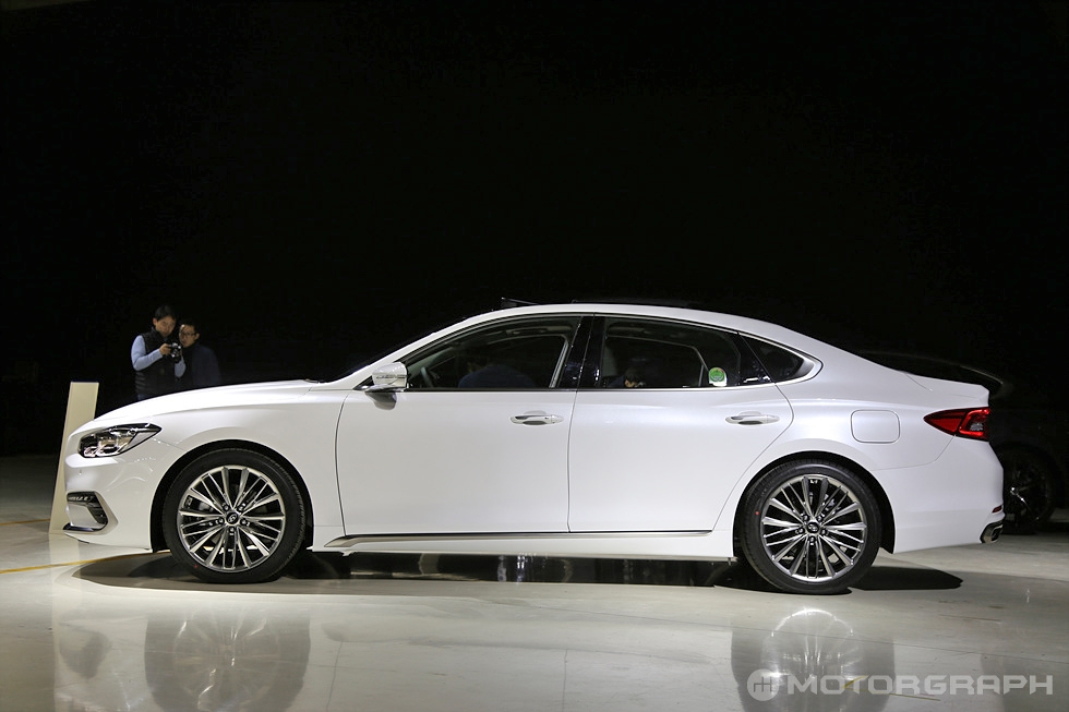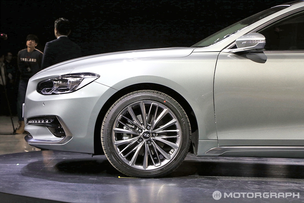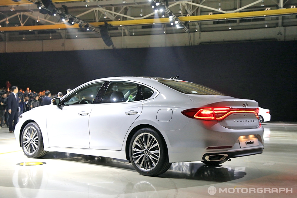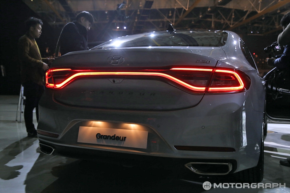 측면 캐릭터 라인은 헤드램프부터 시작되며 뒷부분은 볼륨감을 강조하는 곡선으로 처리했다. 후면부는 기존 그랜저의 스타일을 재해석한 테일램프가 탑재됐으며 이전에 비해 화려한 느낌이다. 루프와 트렁크를 잇는 C필러 라인은 완만하게 만들어 역동적인 느낌을 강조했으며, 새로운 디자인의 휠이 장착됐다.