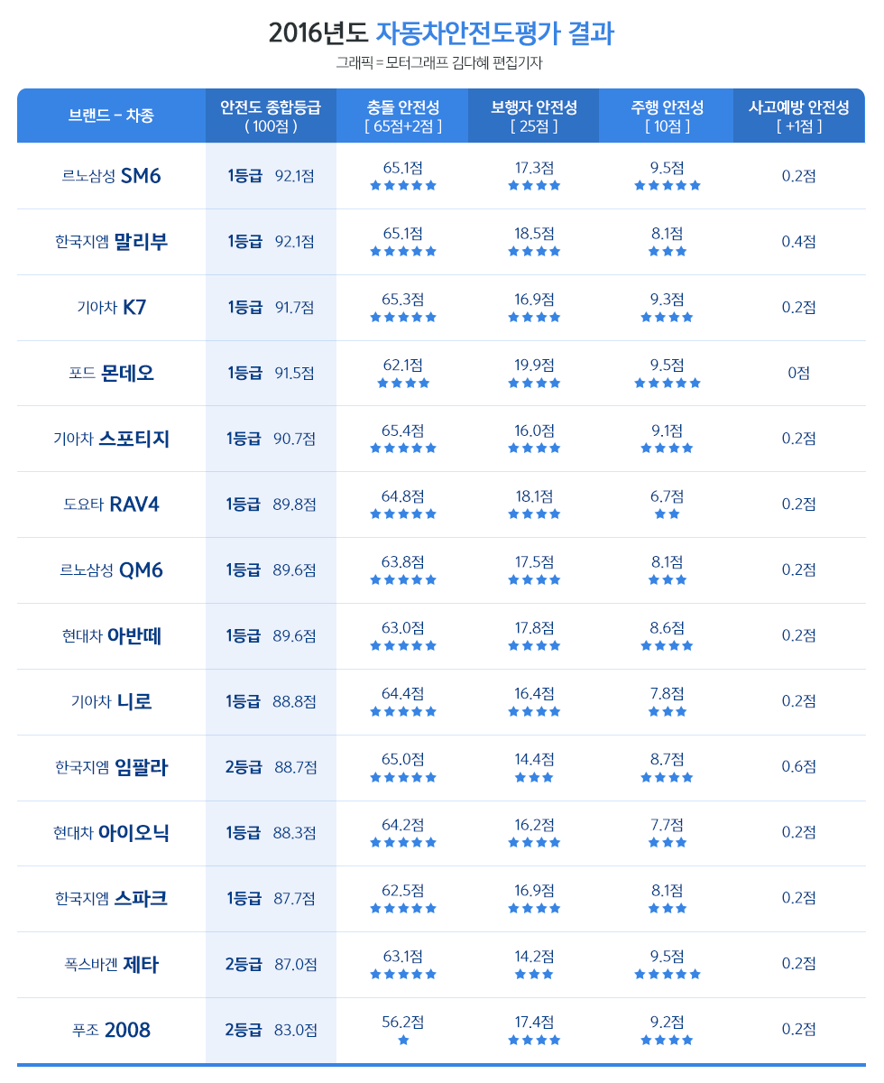 르노삼성 SM6와 한국지엠 말리부가 종합 92.1점으로 가장 높은 점수를 받았다. 기아 K7은 91.7점으로 그 뒤를 이었다. 상위 3개 차종은 '2016 올해의 안전한 차'로 상패를 수여받는다. 세 차종 중 충돌안전성은 K7이 가장 높았고, 보행자 안전성은 말리부, 주행안전성은 SM6 등이 강점을 보였다.
