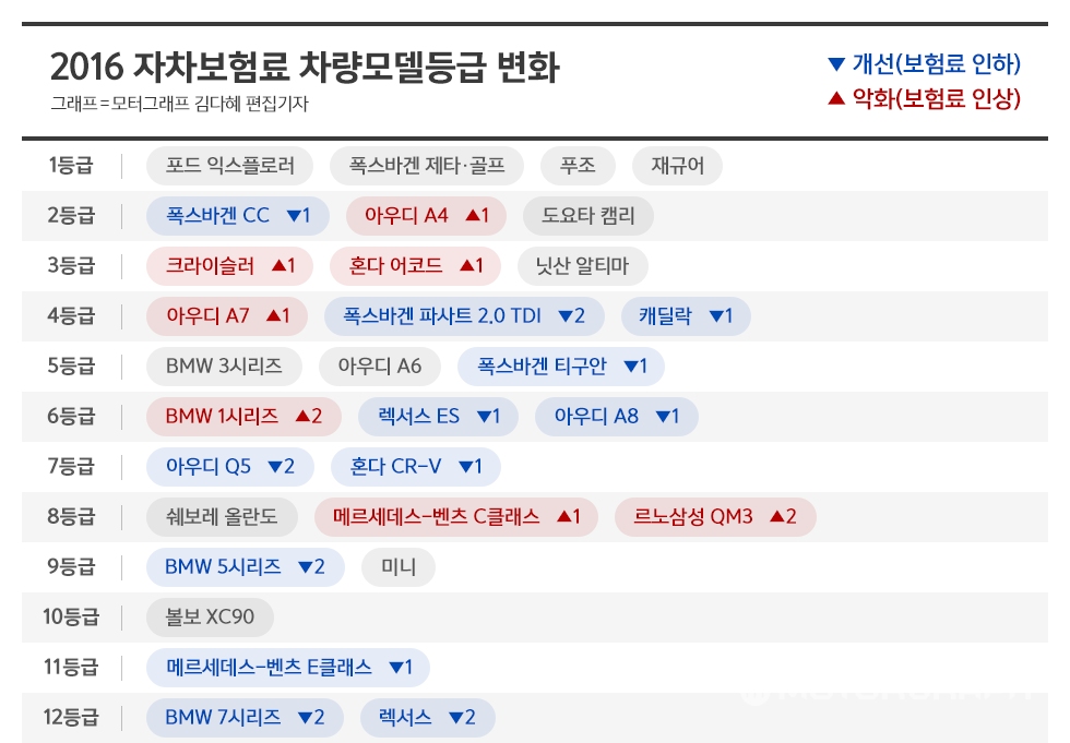 새 등급은 작년 7월부터 올해 6월 기간의 통계를 평가해 조정됐다. 이는 내년 보험사의 차종별 자차보험료 책정 기준으로 활용되는데, 각 등급은 모델에 따라 일괄 적용된다.