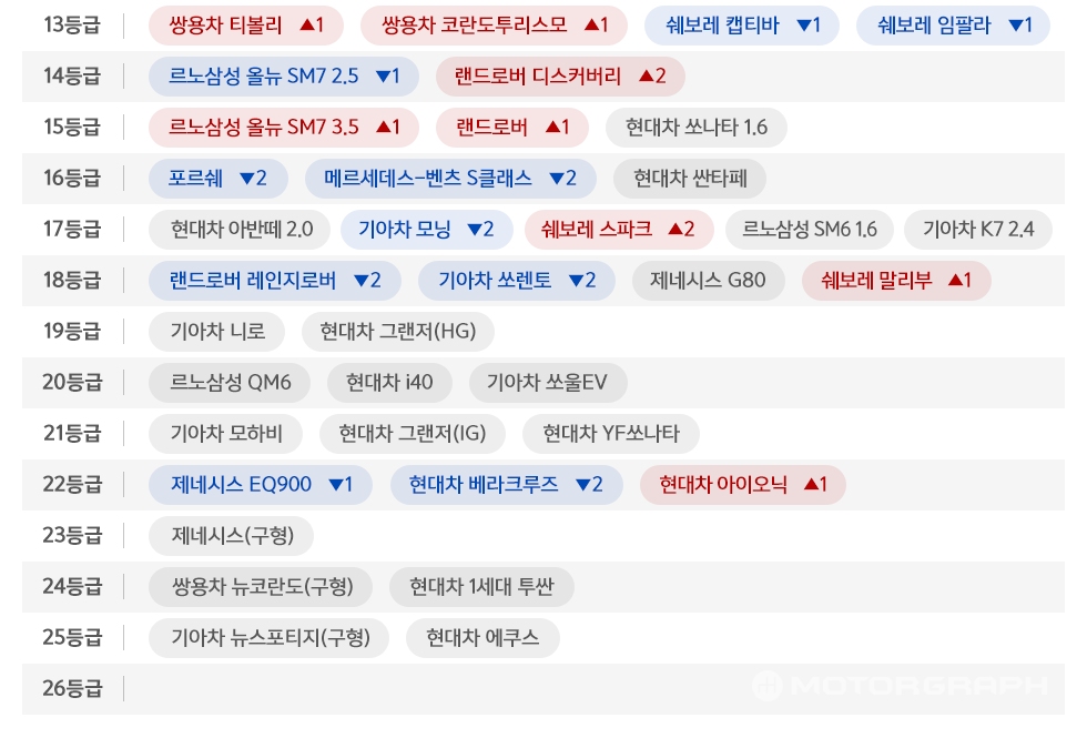 레이(16등급)/뉴프라이드(19등급)/올뉴쏘울(16등급)/뉴K5(20등급)/더뉴쏘울(16등급)/라세티(프리미어1.6)(13등급)/크루즈(13등급)/올뉴말리부1.5(19등급)/뉴베르나(19등급)/아이오닉(22등급)/SM3(18등급)/SM5D(12등급)/라세티(프리미어1.8)(13등급)/크루즈1.8(13등급)/올뉴말리부(18등급)/뉴SM3(신형)(12등급)/올뉴SM7(16등급)/뉴크랜져XG(15등급)/투싼ix(22등급)/오피러스(신형)(15등급)/체어맨W(15등급)/스테이츠맨(11등급)/쏘렌토(16등급)/카니발2(9등급)/카렌스(신형)(11등급)/올뉴카니발(16등급)/올뉴쏘렌토(12등급)/코란도투리스모(13등급)/맥스크루즈(16등급)