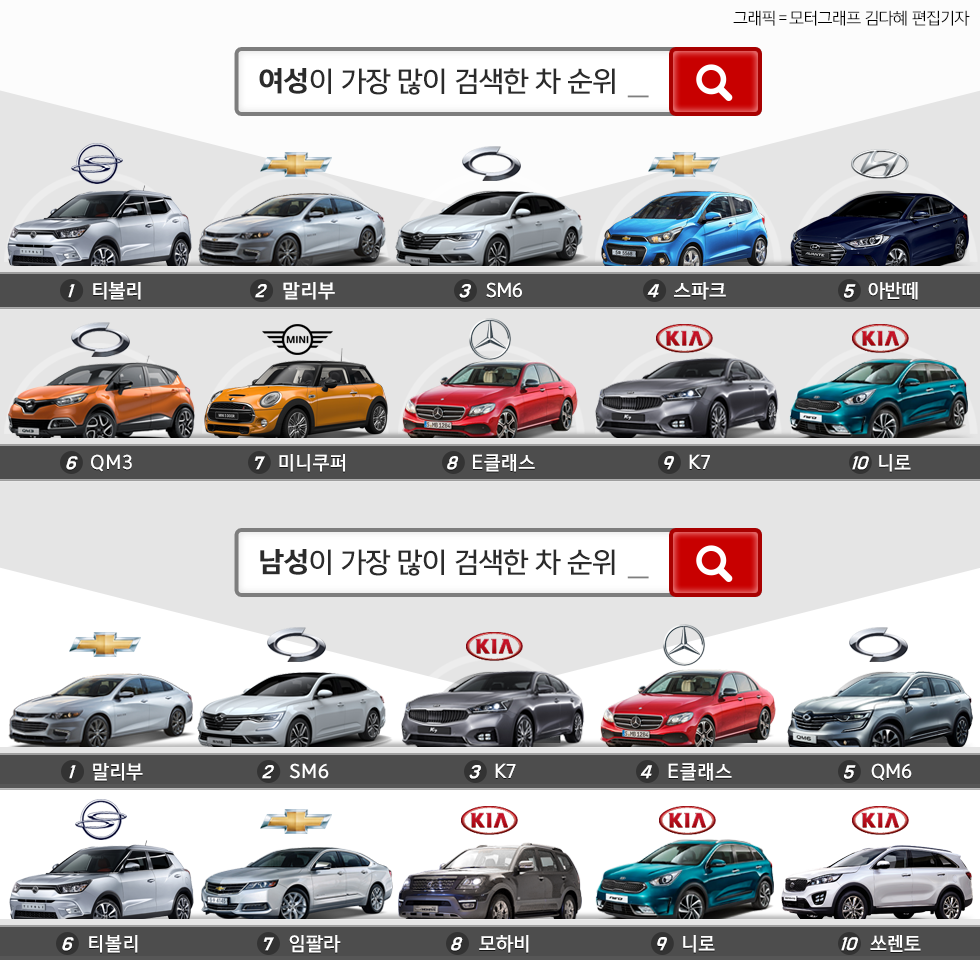 한편, 남성들이 가장 많이 검색된 차도 크게 다르지 않았다. 단, 여성들에 비해 조금 더 크고, 가족적인 차가 많았다. 여성들과 달리 르노삼성차 QM6, 쉐보레 임팔라, 기아차 모하비, 기아차 쏘렌토 등이 TOP10 안에 이름을 올렸다.