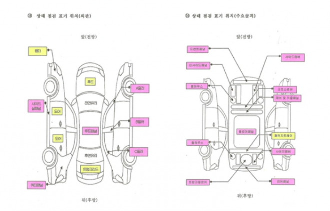 이밖에 수리가 되었다면 사고차로 등록될 수 있기 때문에 주의 깊게 보아야 한다. 아래 그림의 노란색 부위의 경우 무사고 수리부위이며 보라색은 사고 수리부위이다.