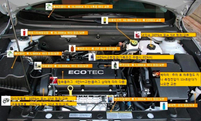 엔진룸 안에 있는 소모품류(파워스티어링오일, 전자식 제외), 브레이크오일, 연료필터, 드라이브 벨트, 배터리(출고 후 3~5년 후 교체) 등은 판매자에게 구두로 물어보거나 만약 잘 모르거나 교환을 안 했다고 하면 주행거리·주기 기준에 맞춰 향후 교환해줘야 한다.