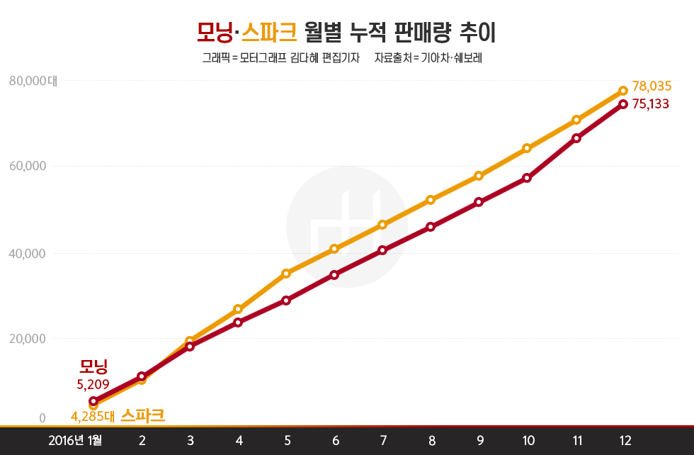 모닝도 만만하지 않았다. 워낙 고정 소비층이 두껍다지만, 신차 출시를 앞두고도 월 6000대 이상 판매했다. 특히, 다양한 프로모션을 통해 11월 9256대, 12월 8208대 등 하반기 실적을 최대한 끌어올리며 스파크를 바짝 뒤쫓았다. 작년 총 판매량도 7만5133대로, 스파크(7만8035대)에 겨우 2902대 적을 뿐이다.