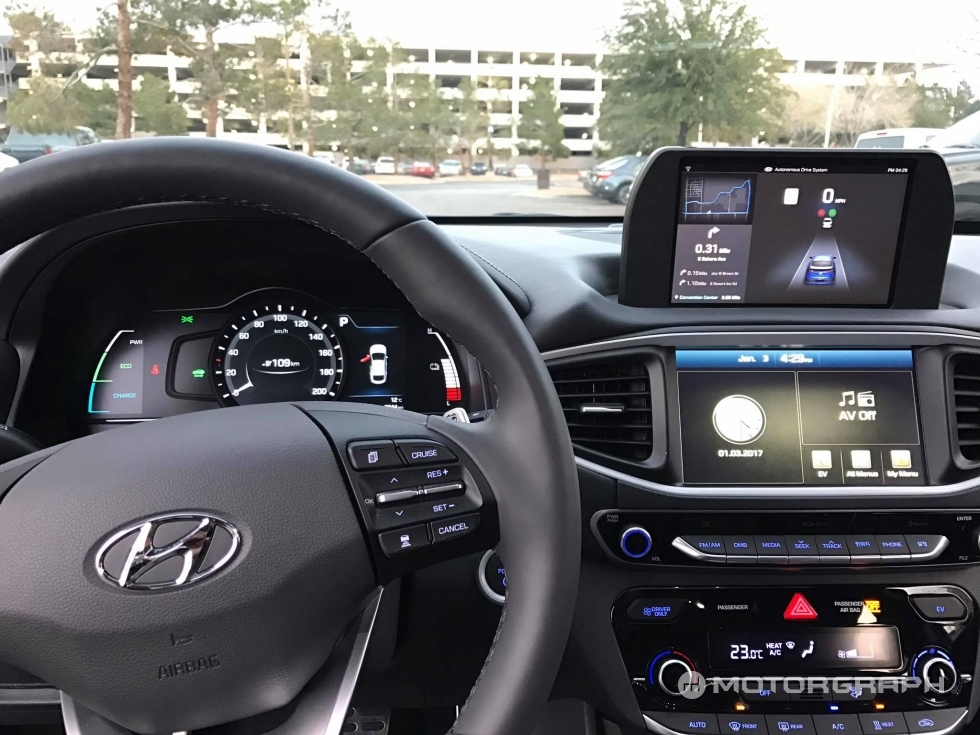 기존 아이오닉 전기차에 있던 차선 이탈 경보 카메라, 스마트크루즈컨트롤 레이더, 후측방경보 레이더, 핸들모터 시스템 등을 최대한 그대로 이용해 낮은 가격의 양산 자율주행차를 만들기 위해 노력 했다는 설명이다. 현대차 관계자의 말에 따르면 레이더는 앞차를 통과해 앞의 앞차까지 어렴풋이 인식 할 수 있으며 라이다 등은 레이저를 이용해 직진성이 우수하므로 더 정밀한 측정이 가능해진다는 설명이다. 광학 카메라를 이용하면 멀리 점처럼 보이는 사물까지도 이론적으론 인식할 수 있다고 했다. 스스로 주행하는 차는 이게 처음이 아니지만 이렇게 낮은 가격에 스스로 주행하는 차는 이게 처음일거라는 생각이 들 정도였다.