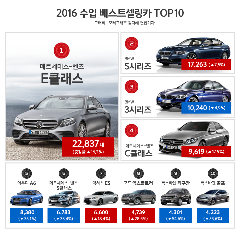 2016년 수입차 시장은 BMW와 메르세데스-벤츠의 한판 승부가 벌어졌다. 메르세데스-벤츠 코리아는 E클래스를 중심으로 법인 설립 13년 만에 수입차 판매 1위에 올랐다. 이전까지 7년 연속 수입차 판매 1위 자리를 지켜온 BMW지만, 지난해만큼은 메르세데스-벤츠를 쫓아가기 급급했다.