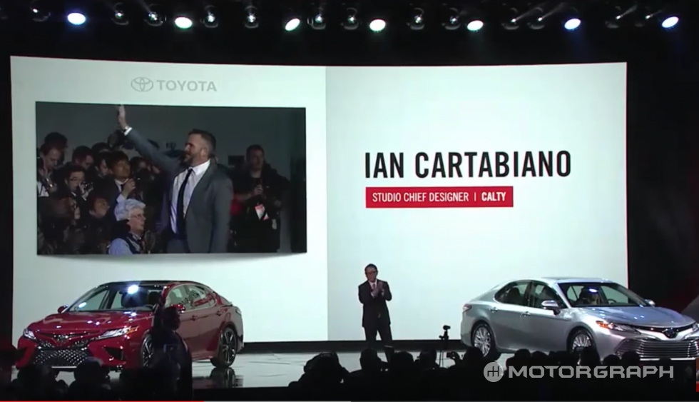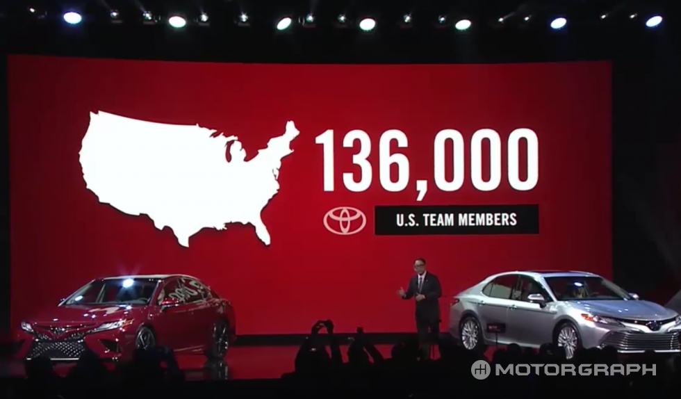 아키오 도요다는 캠리의 미국인 디자이너 이안 카타비아노(Ian Cartabiano)를 일으켜 세우고 치하한 후 도요타가 미국에서 무려 13만6000명을 고용하고 있다고 강조했다. 또한 앞으로 5년간 100억불(12조원)을 미국에 투자하겠다고 밝혔다. 15년간 미국서 가장 많이 팔린 차라는 점과 공장에서 근무하는 미국인들의 모습이 화면에 등장했다. 보호무역을 강조하는 트럼프 체제에서 도요타가 누구보다 미국적인 회사라는 점을 분명히 한 셈이다.