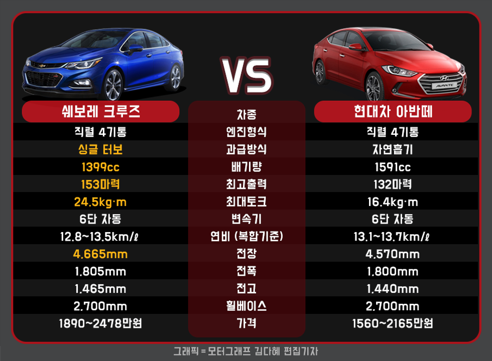 아반떼의 복합 연비는 13.7km/l(15~16인치 타이어 기준)다. 타이어 사이즈를 감안하면 쉐보레 신형 크루즈와 비슷한 수준이다.