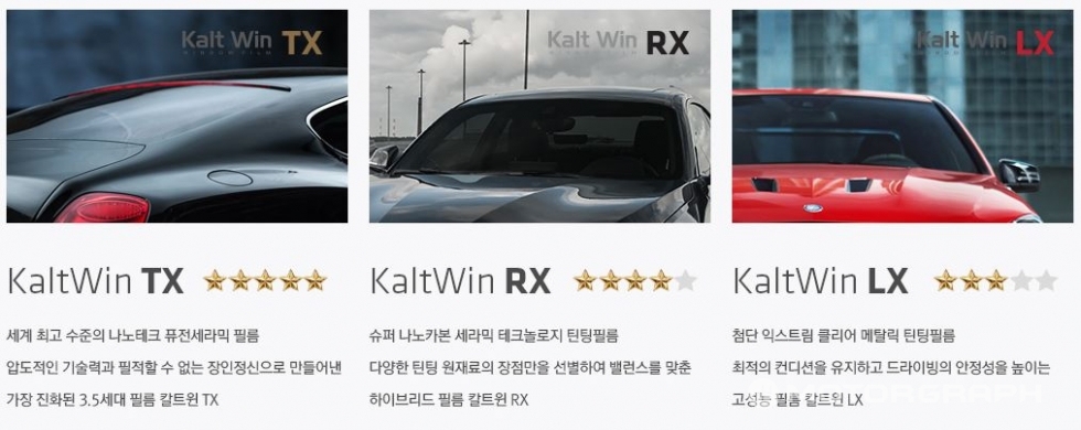 칼트윈 틴팅 필름은 세라믹 필름 기반의 TX를 비롯해 카본세라믹 필름 기반의 RX, 메탈 필름 기반의 LX 등 총 3가지로 구성됐다. 시공은 아이나비 프리미엄 스토어를 비롯해 전국 57개 대리점에서 가능하다.
