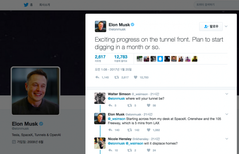 테슬라 CEO인 일론 머스크는 25일(현지시각), 트위터를 통해 (터널 작업과 관련해)신나는 진전이 있었다면서 한 달 후쯤 착공에 들어갈 것이라 말했다.
