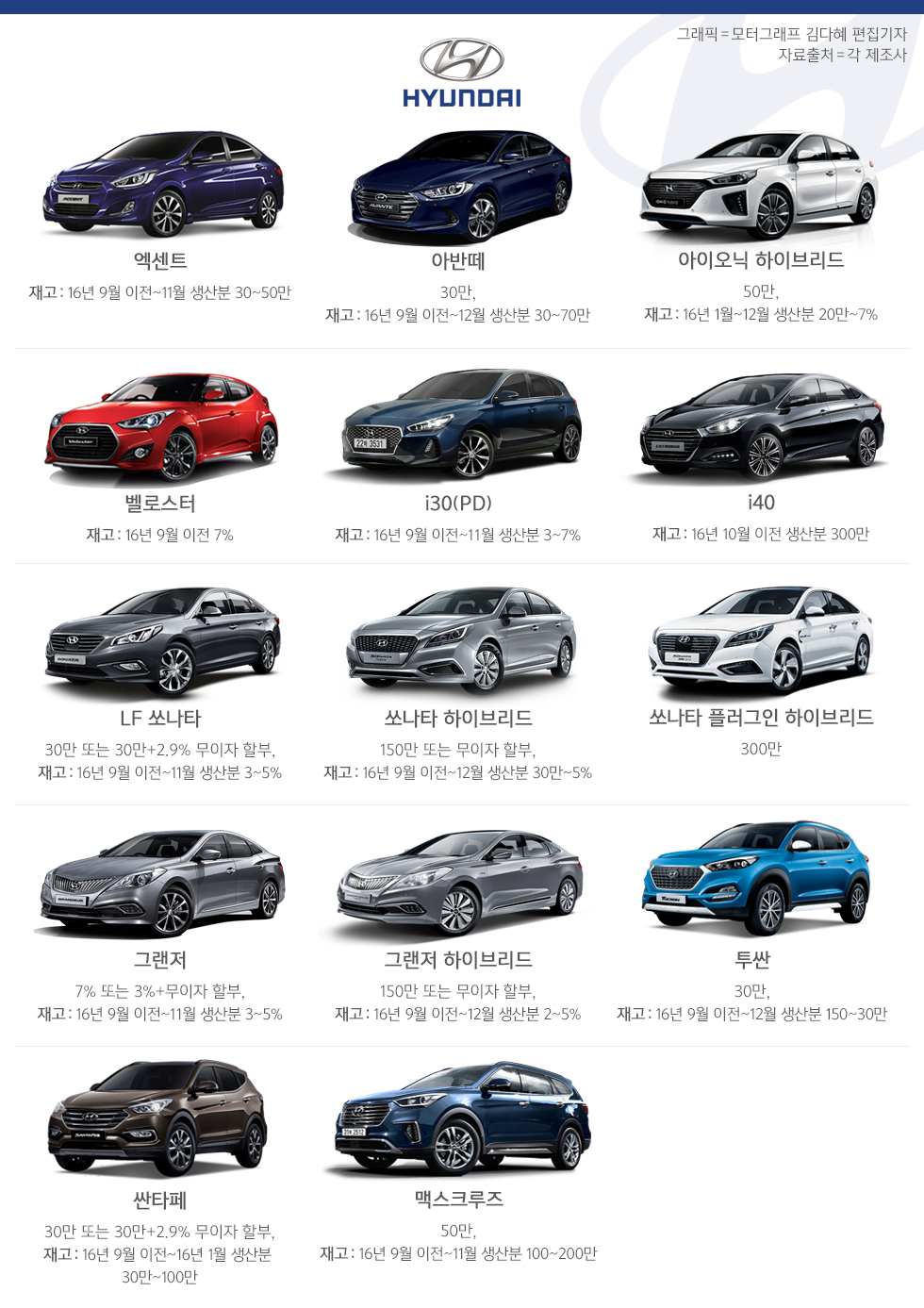 이달 현대차 판매조건은 전달과 같은 수준을 유지했다. 2016년식 재고 모델을 중심으로 제한적 혜택이 이어졌다. 다만, 시장 예측과 달리 i30나 아슬란과 같은 비인기 차종에 대한 기본 할인 혜택도 사라졌다.