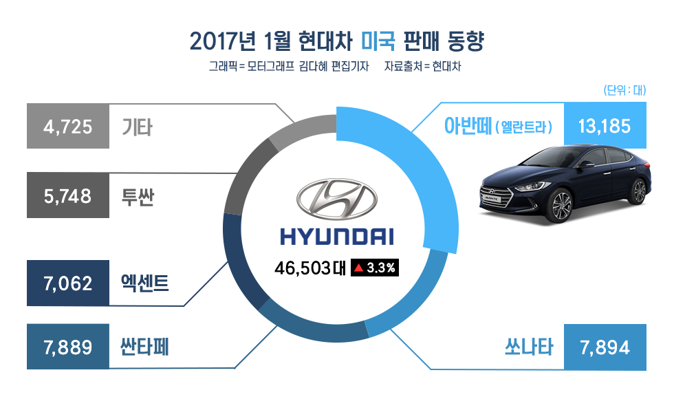현대차는 엘란트라(국내명 아반떼, 전년대비 +33.4%)를 필두로 엑센트(+39.8%), 싼타페(+53.5%), 투싼(+10.2%) 등 소형 승용차와 SUV 제품군이 실적을 이끌었다. 다만, 주력 차종인 쏘나타는 지난해 1월의 절반 수준인 7894대에 그쳤다.