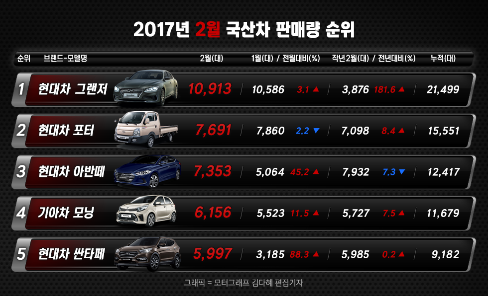 현대차는 지난달 내수 시장에서 전년대비 8.7% 증가한 5만3113대를 달성했다. 차종별로 그랜저(구형 포함, 1만913대)가 작년 12월부터 3달 연속 월 1만대 판매를 기록했다. 신형 그랜저는 초기 품질 문제에도 불구하고, 인기가 쉽게 가라앉지 않을 전망이다.