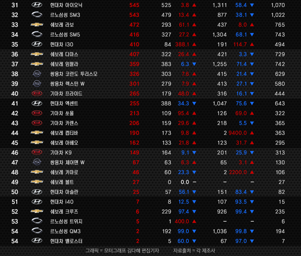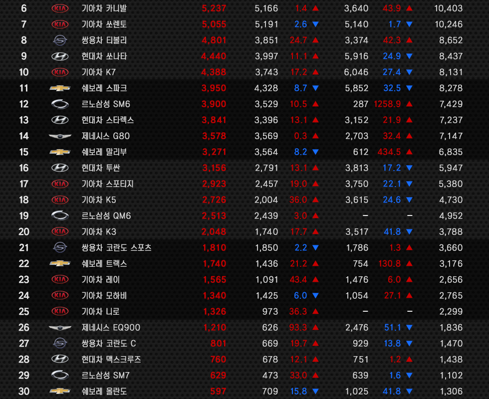 이어 포터(7691대)와 아반떼(7353대), 쏘나타(4440대) 등이 현대차 실적을 뒷받침했다. 역대 베스트셀링카인 아반떼와 쏘나타는 올해 선두 경쟁에서 한 발 물러선 모양새다. 아반떼의 경우 B세그먼트 SUV에게 엔트리카 고객층을 빼앗기고 있다.
