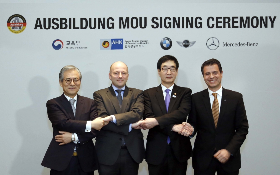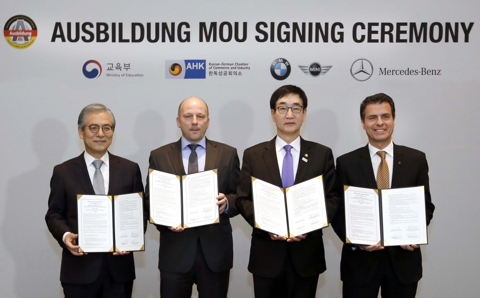 교육부와 한독상공회의소, BMW그룹 코리아, 그리고 메르세데스-벤츠 코리아는 6일 서울 밀레니엄 힐튼 호텔에서 아우스빌둥 도입 양해각서(MOU)를 체결하고 향후 계획 등을 발표했다.