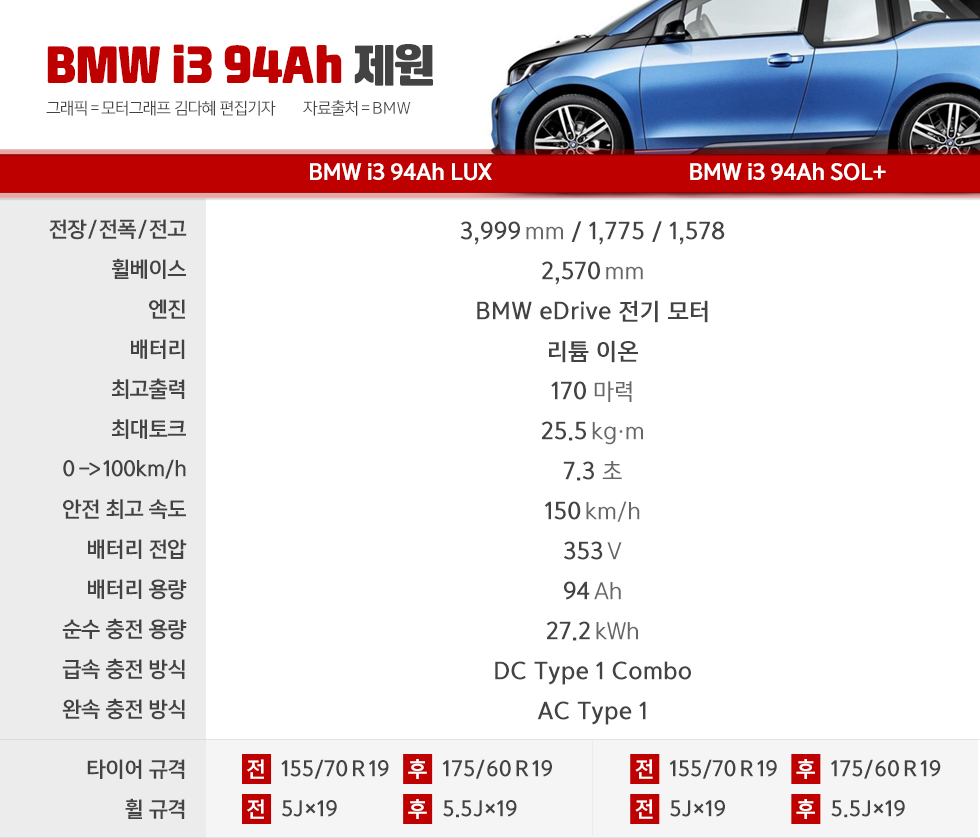 BMW i3는 전 세계 시장에서 6만대 이상 판매고를 기록하며, 소형 전기차의 대표적 성공 모델로 손꼽힌다. 이번 BMW i3 94Ah는 33kWh급 94Ah 리튬이온 배터리를 탑재해 기존 대비 약 50% 가량 주행가능거리가 늘어났다. 회사 측에 따르면 1회 충전시 최대 200km까지 주행이 가능하다.