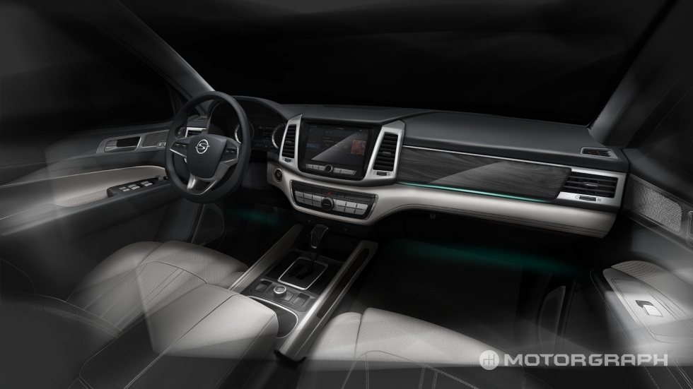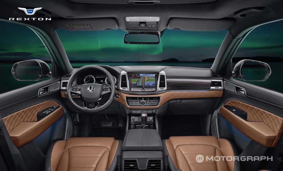 실내는 퀼팅 가죽과 우드 트림, 크롬 소재 등을 적극 사용해 고급감을 살렸으며, 엠비언트 라이트도 적용해 우아한 분위기를 연출했다. 센터페시아는 기능에 충실한듯 깔끔하게 구성됐는데, 중앙에는 각종 인포테인먼트 시스템을 조작할 수 있는 디스플레이가 장착됐다. 하단에는 공조기 제어 등을 위한 각종 버튼들이 자리하고 있다. 기어노브와 스티어링휠은 코란도C 등과 비슷한 느낌이다.