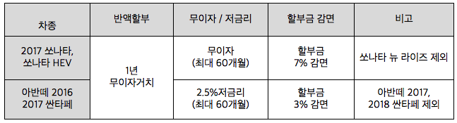 대상 차종은 승용과 RV를 비롯해 생계형 차종인 포터 및 스타렉스 등이다. 최대 3.4%p 인하분을 기준으로 아반떼(할부원금 평균 1400만원)는 121만원, 쏘나타(할부원금 평균 1750만원)는 약 151만원, 포터(할부원금 평균 1,250만원)는 약 108만원을 덜 내게 된다.