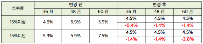 이에 따라 표준형 할부구매(원리금 균등 상환 방식)로 차량을 구입할 경우 최대 3.4%p에서 최저 0.4%p의 금리 인하 절감 효과가 발생한다.