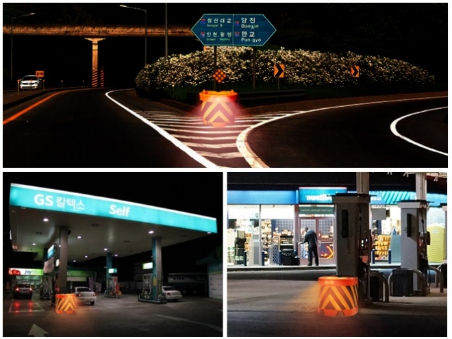 특허를 획득한 신도산업의 태양광 충격방지탱크는 고휘도 LED 쏠라 셀을 적용해 기존 제품의 문제점이었던 야간 시인성을 확보했다. 쏠라 셀은 맑은 날 하루 12시간 완전 충전시 4일간 작동이 가능한 것으로 알려졌다. 특히 주위 밝기에 따라 순차 점멸 기능을 제공해 보다 효율적인 성능을 제공한다. 해당 부품은 구조가 단순하고 설치가 간편해 유지보수 비용도 저렴하다.