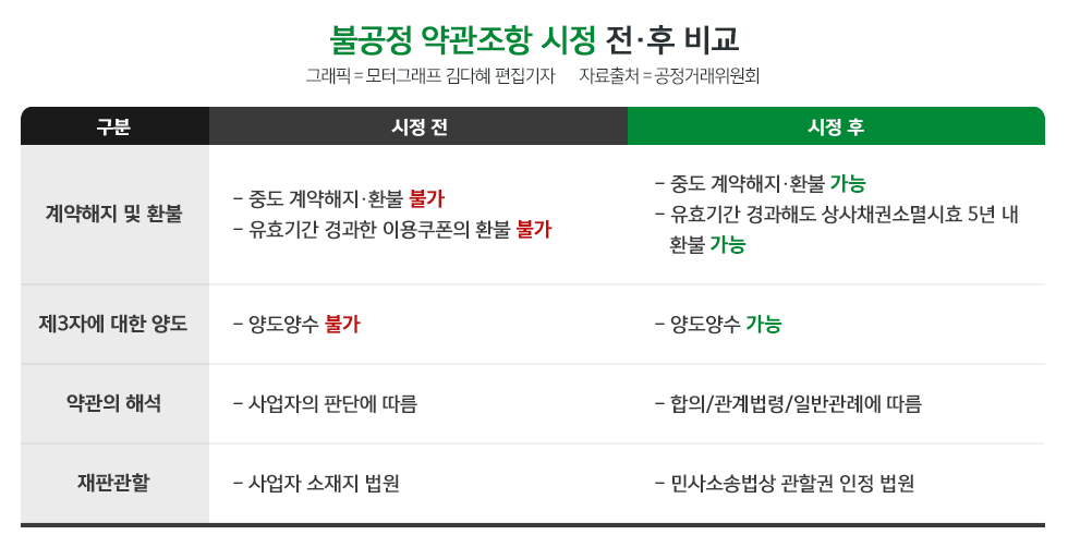 이 밖에 고객과 사업자 간 계약 내용에 대한 해석 차이가 있을 경우, 사업자 판정에 따르는 조항과 사업자 주소지 관할 법원에서만 분쟁을 다툴 수 있도록 한 조항도 삭제했다.