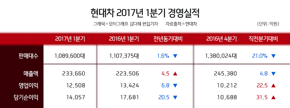 1분기 판매대수는 108만9600대로, 전년동기대비 1.6% 하락했다. 그러나 매출액은 판매량 감소에도 불구하고 지난해보다 4.5% 늘어난 23조3660억원을 달성했다. 이는 고부가가치의 중대형 차급 및 SUV 판매 호조에 힘입어 제품 믹스가 개선됐기 때문이다.