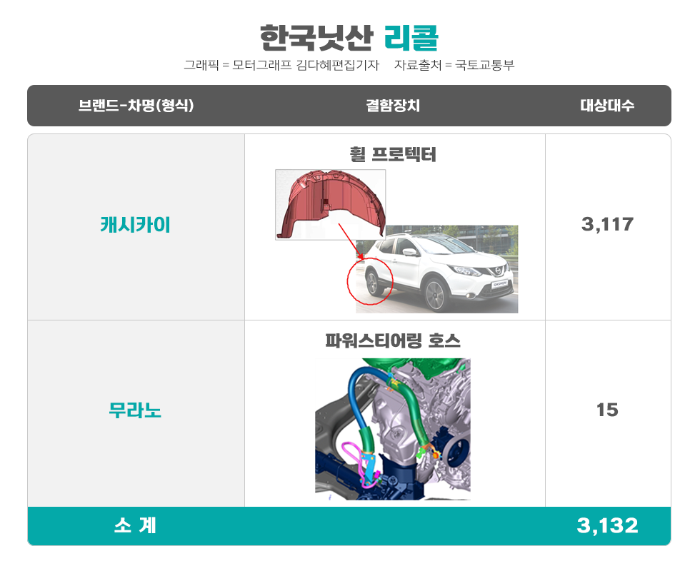 리콜 대상은 2013년 11월08일부터 2016년 5월27일까지 생산된 캐시카이 3117대와 2013년 7월18일부터 2014년 2월10일까지 제작된 무라노 15등 총 3132대이다.