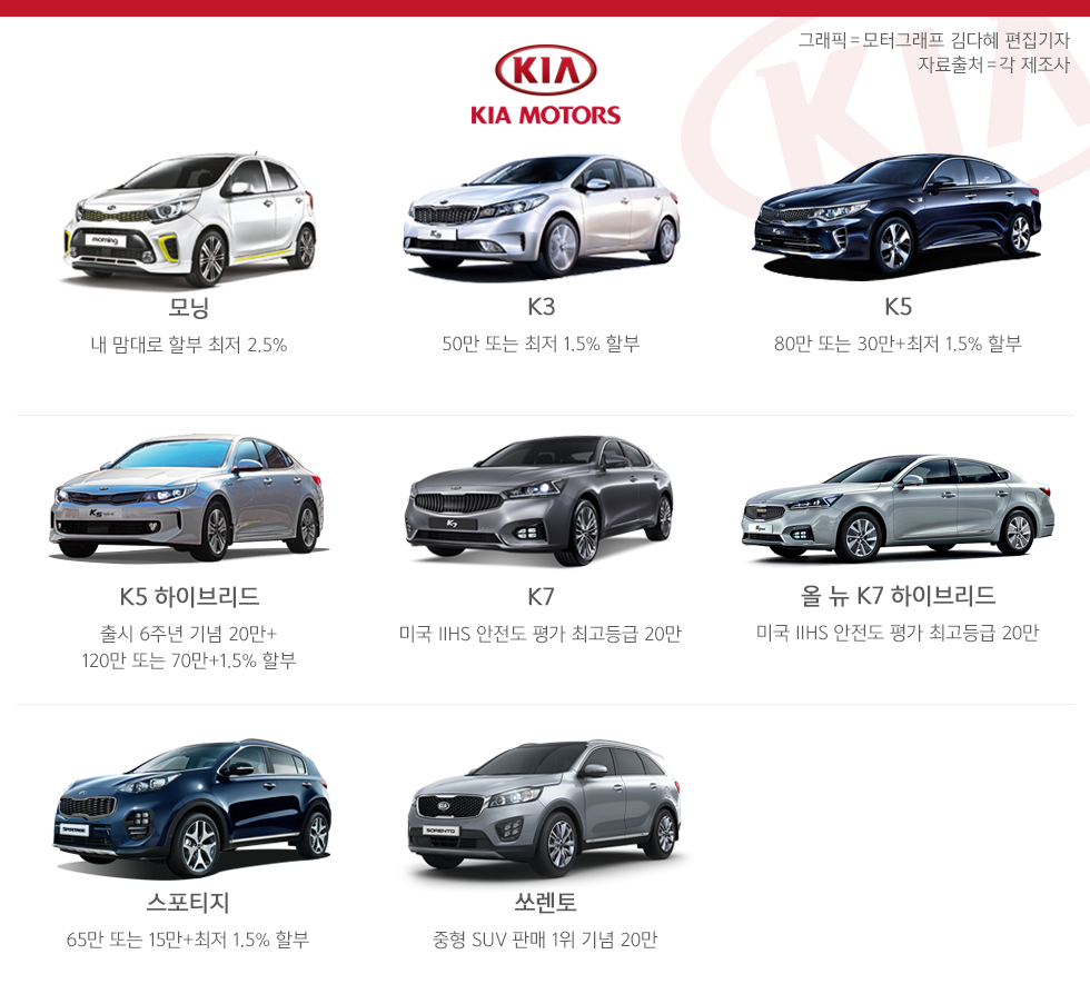 단, 모닝과 스포티지, K3, K5 등에 적용된 저금리(1.5~2.5%) 할부 혜택은 5월에도 유지됐다.