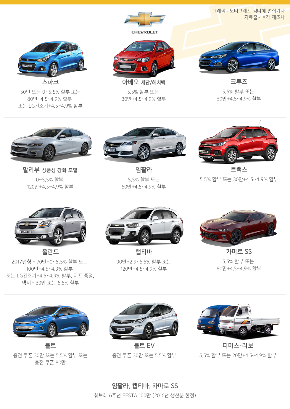 지난해보다 판매량이 절반 가까이 떨어진 스파크는 차 값의 10%에 달하는 가전제품을 사은품으로 제공한다. 단종설에 시달린 올란도 역시 가전제품 외 100만원까지 현금 할인 혜택을 지원한다. 이외 말리부가 0% 무이자 할부 조건을 적용하고 나섰다.