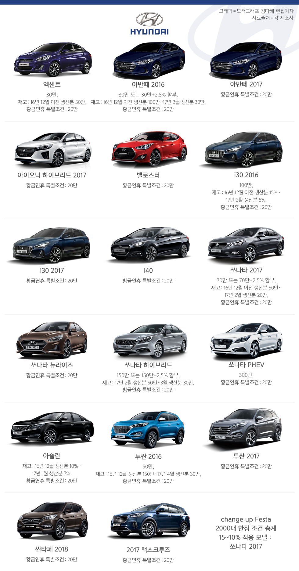기본 할인 조건은 2016년식 재고 물량을 중심으로, 30만원부터 300만원까지 적용된다. 특히 페이스리프트 이전 모델인 '쏘나타 2017'의 경우 2000대 한정 최대 15% 할인 혜택을 누릴 수 있다.