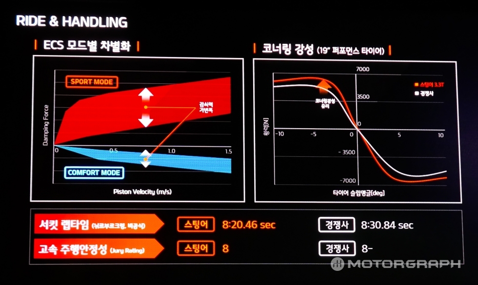 스팅어는 드라이빙 모드에 따라 감쇠력을 감소하는 방식의 가변 서스펜션을 적용했으며 코너링 강성이 우수해서 높은 횡력을 버텨낼 수 있다는 점을 강조했다.