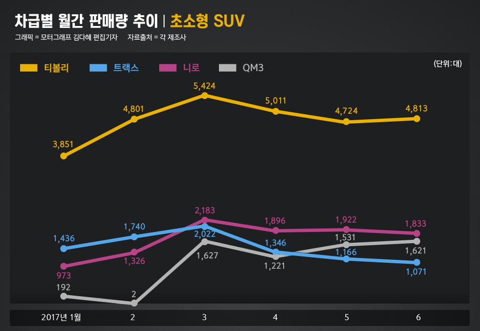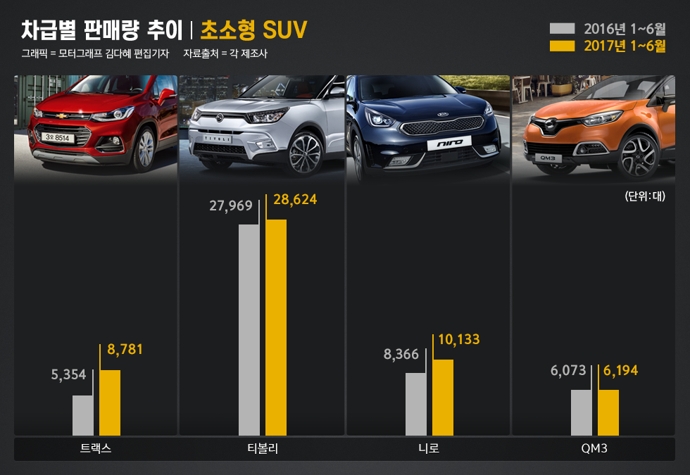 모터그래프 조사에 따르면 올해 상반기(1~6월) 국내 초소형 SUV 판매량은 5만3732대로, 전년(4만7762대) 대비 12.5% 증가했다. 티볼리를 비롯해 트랙스와 니로, QM3 등 전 모델이 상승세를 그리며 시장을 안정적으로 키워나가는 모습이다.